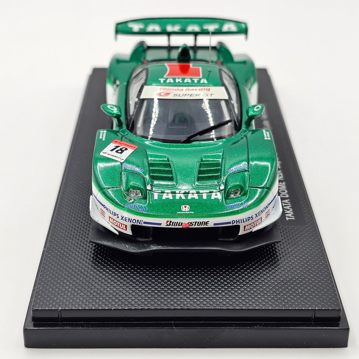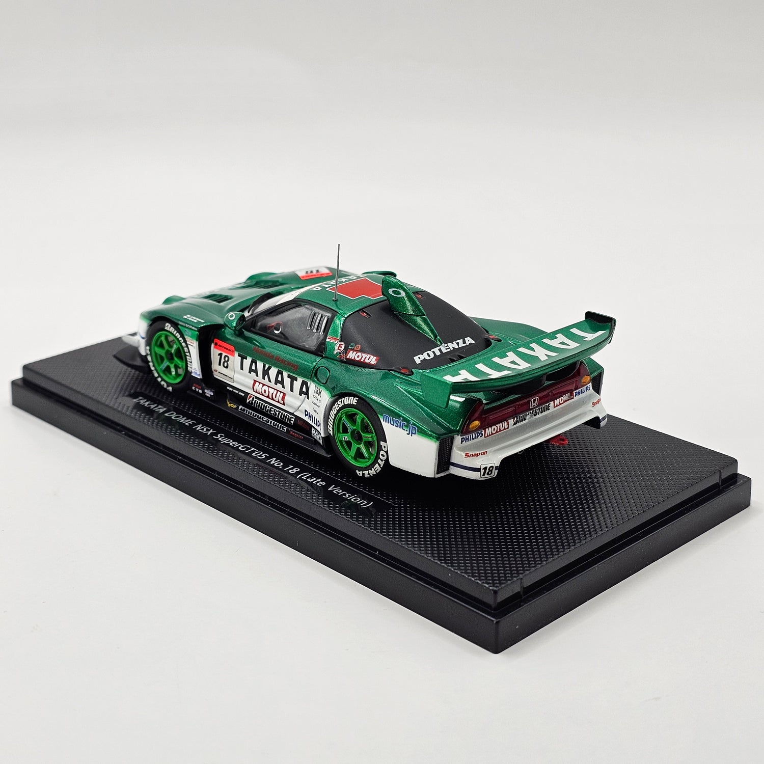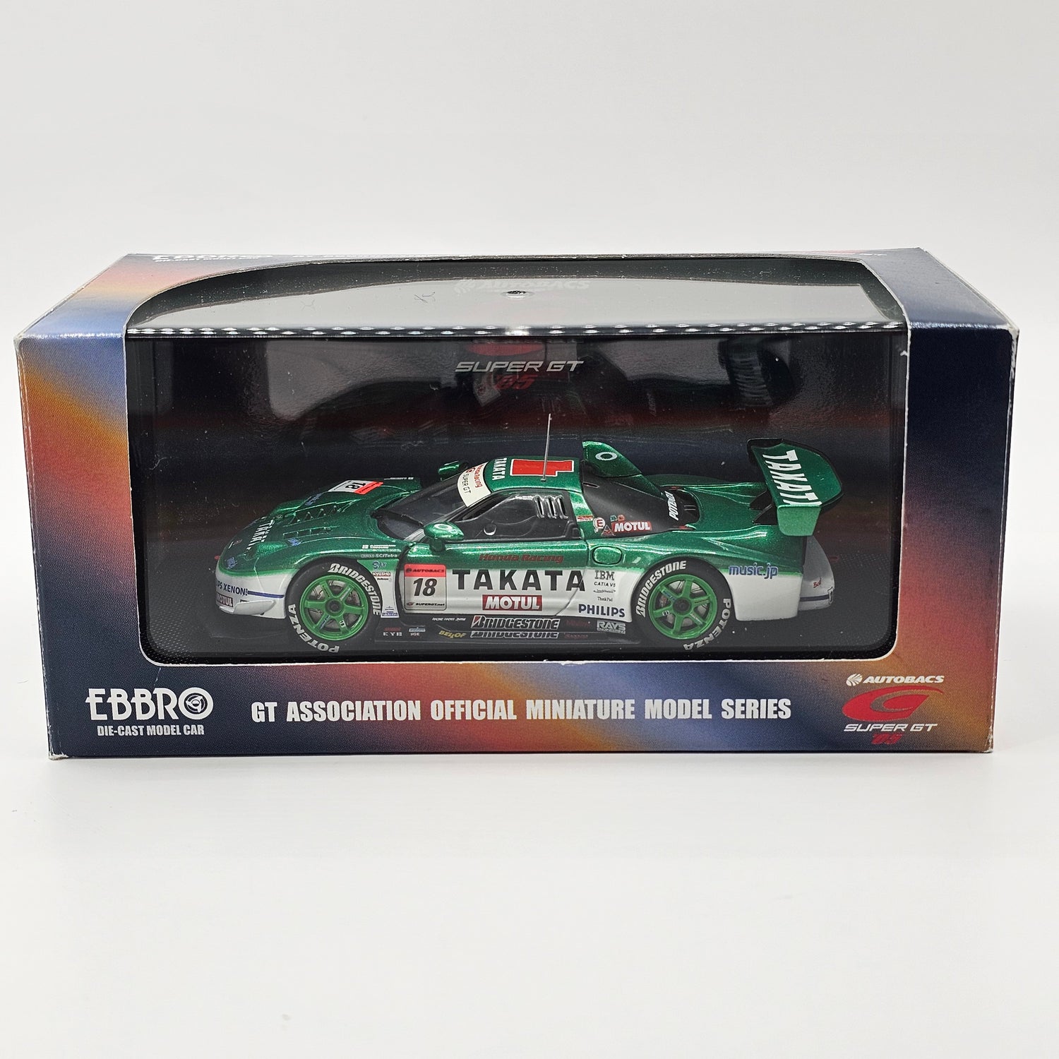 Highly detailed diecast EBBRO model of the Honda NSX GT500 #18 Takata Dome Racing, as driven by Takashi Kogure & Ryō Michigami in the 2005 Super GT championship, in 1/43 scale.