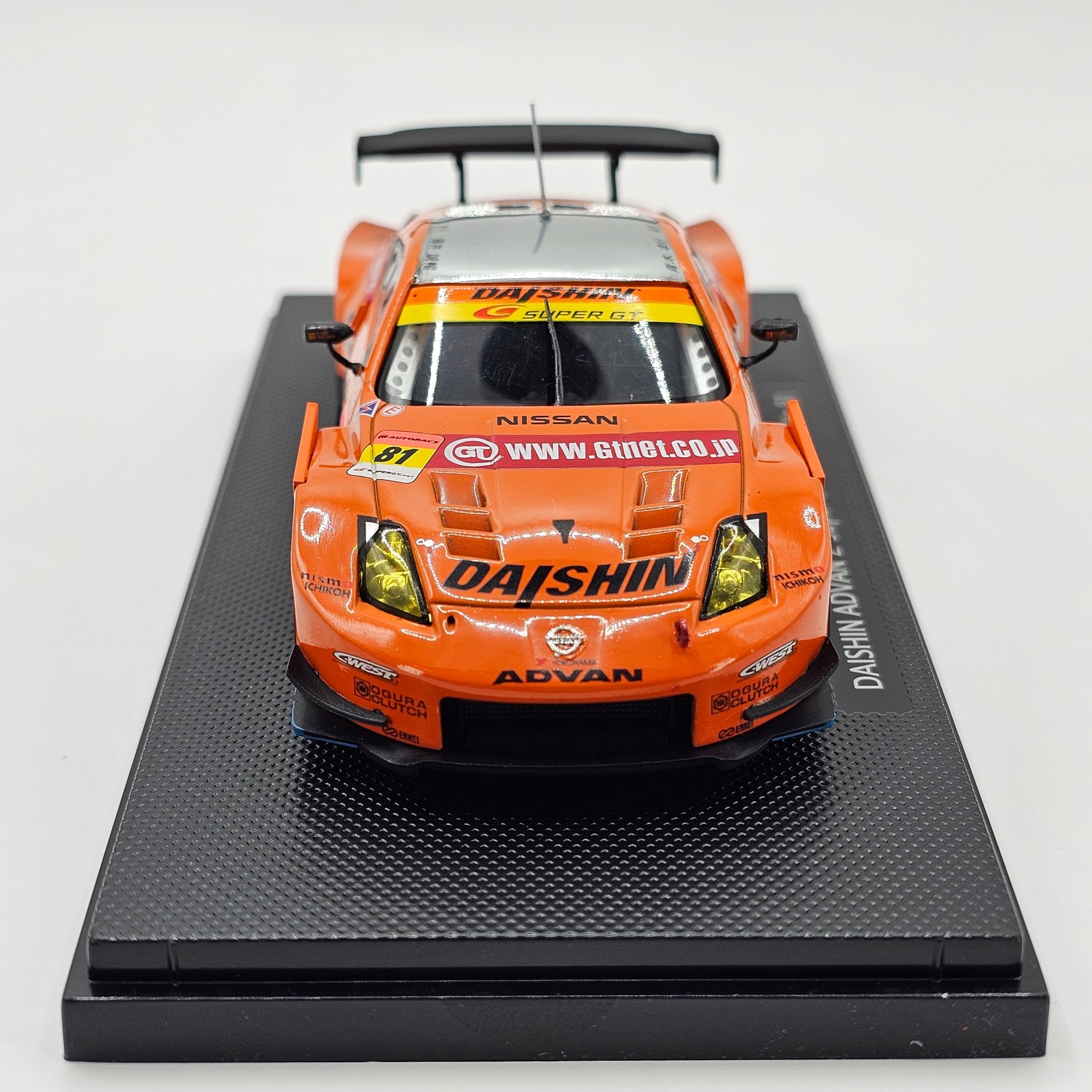 Highly detailed, discontinued and now quite rare 1/43 scale diecast EBBRO model of the Nissan Fairlady Z #81 Team Daishin, as driven by Takayuki Aoki & Tomonobu Fujii throughout the 2008 Super GT season in the GT300 class.