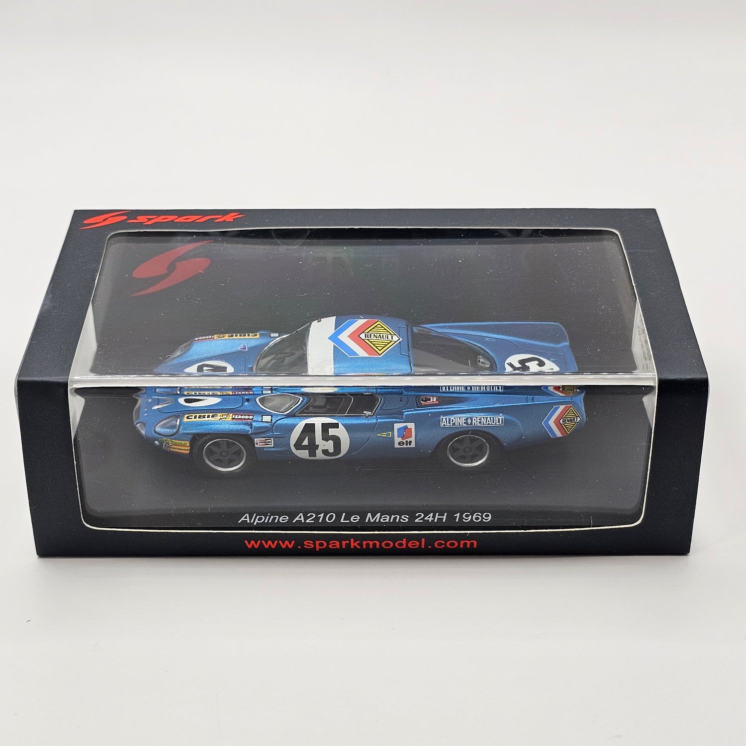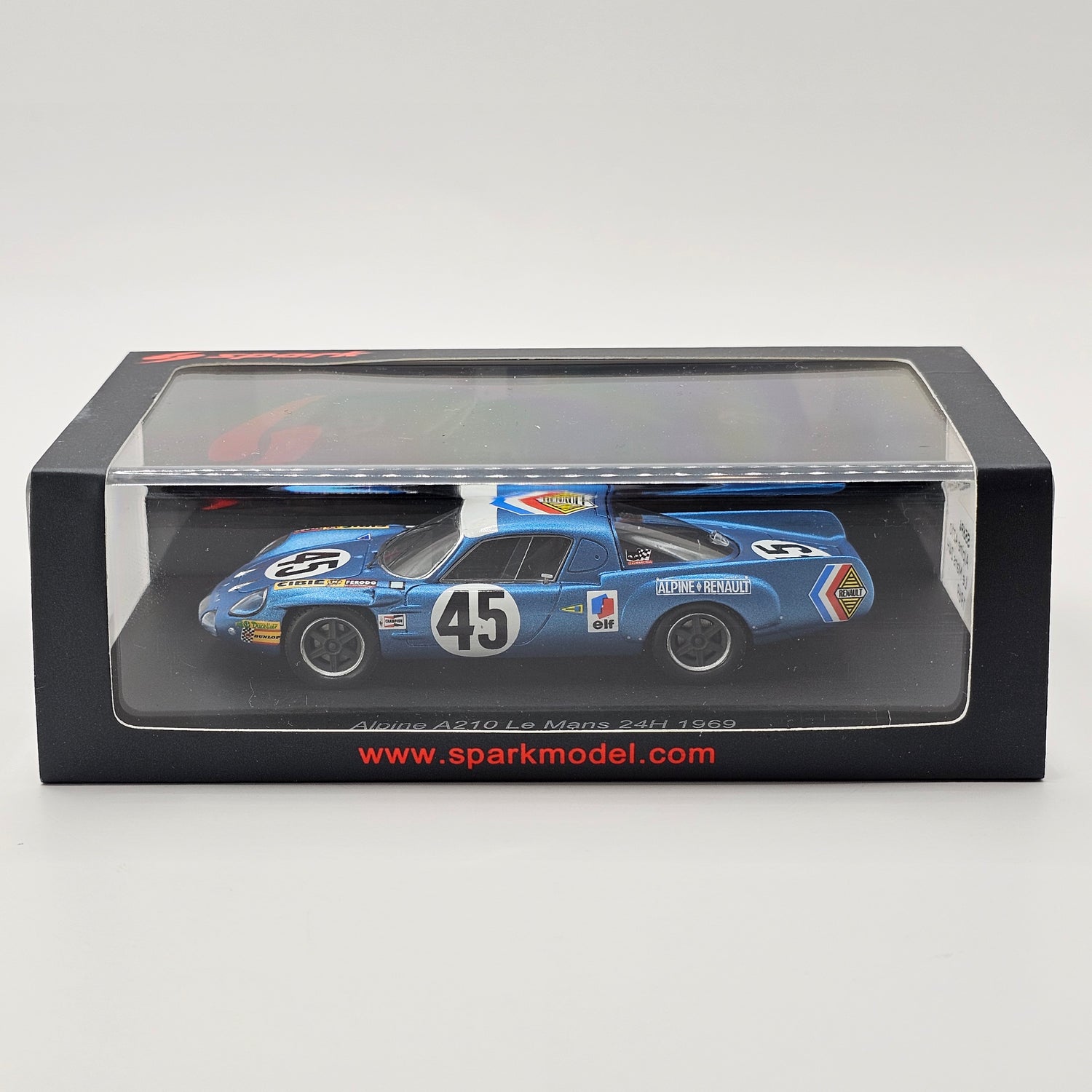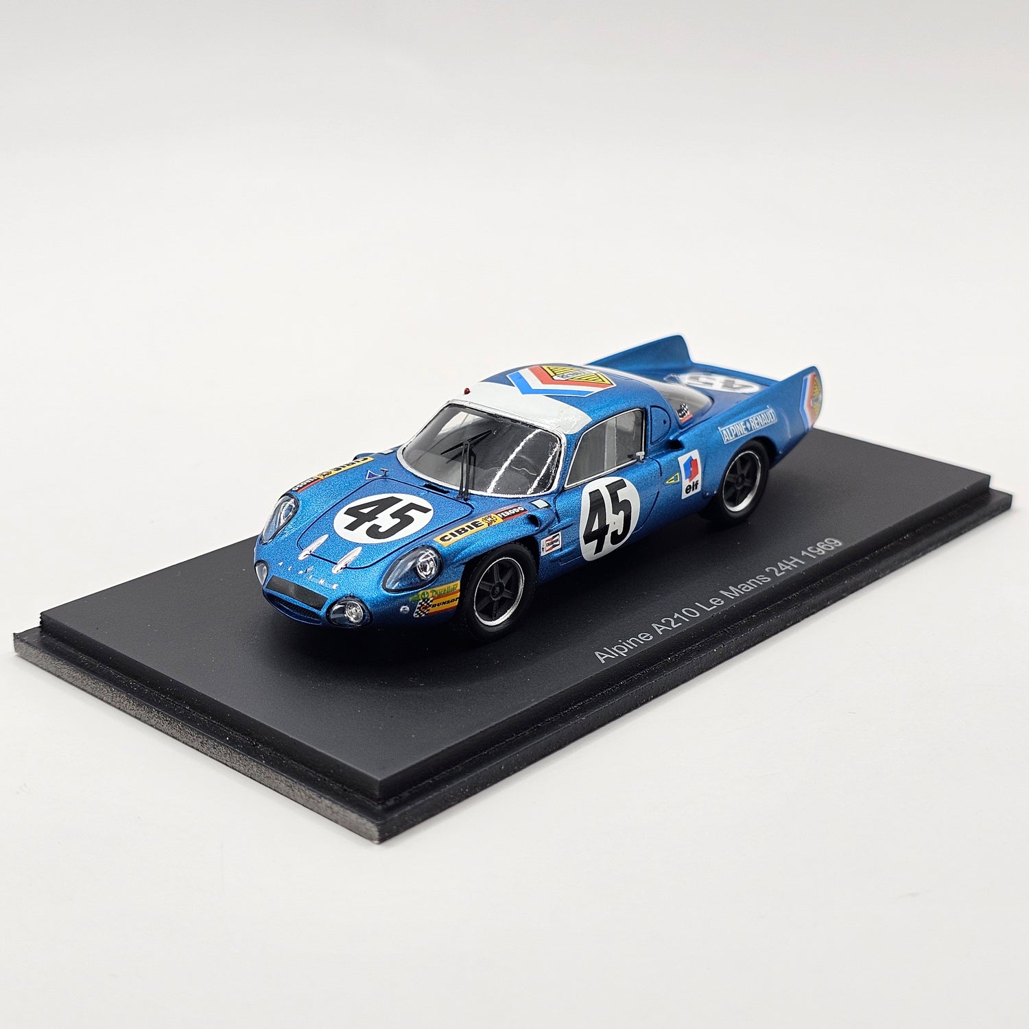 Highly detailed resin Spark model of the Alpine A210 #45 Société des Automobiles, as driven by Bob Wollek & Jean-Claude Killy at the 1969 24 Hours of Le Mans.