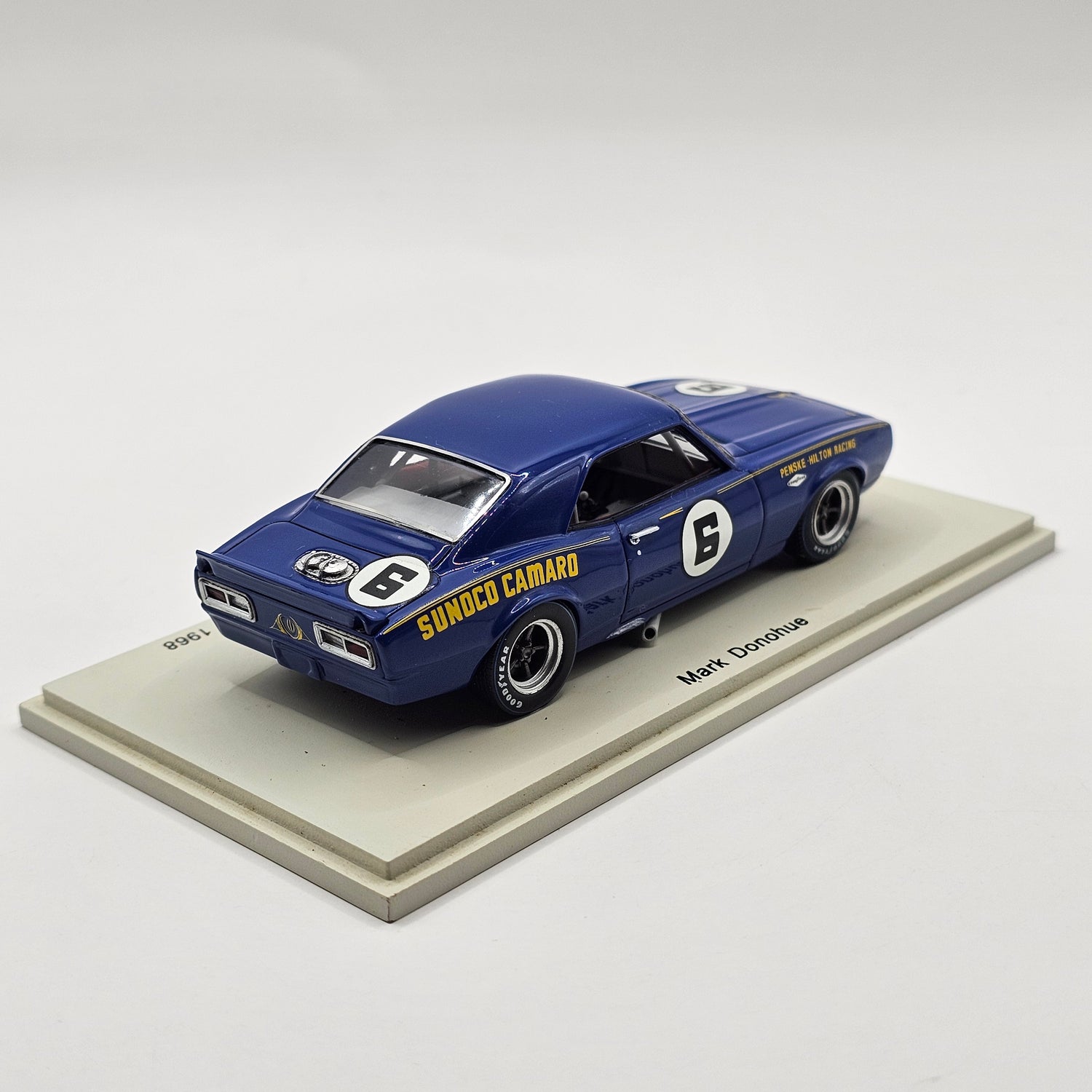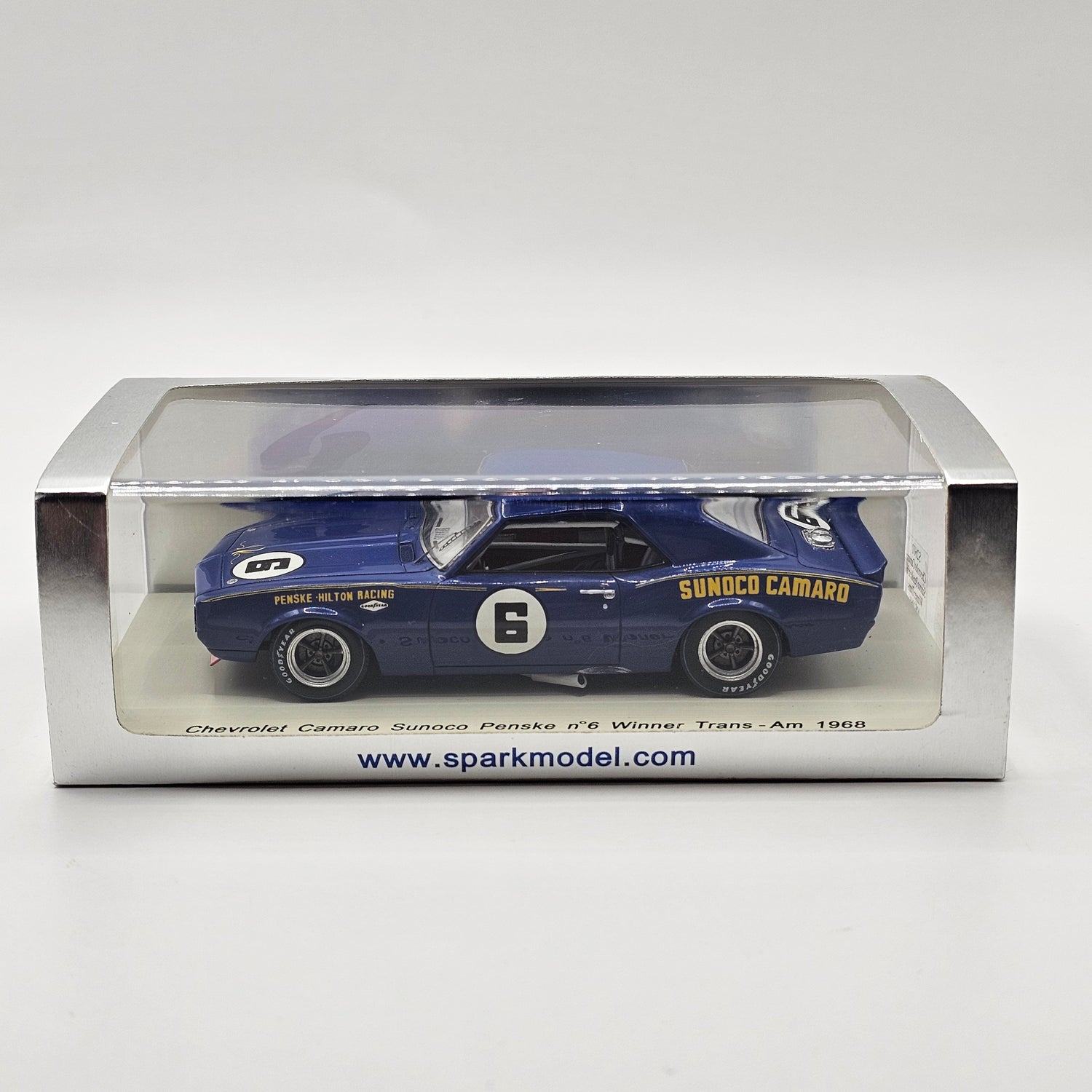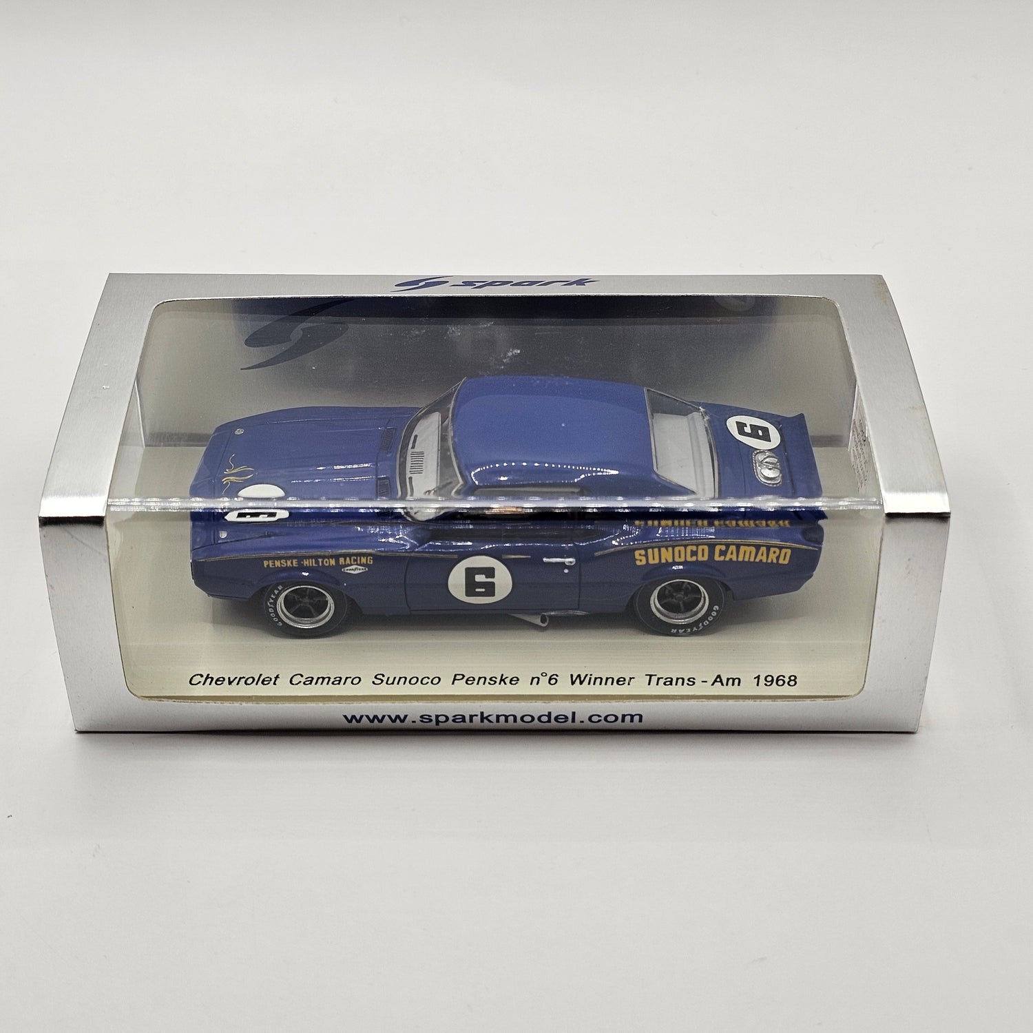 Highly detailed resin Spark model of the Chevrolet Camaro Z28 #6 Penske-Hilton Racing Trans Am 1968 Winner in 1/43 scale.