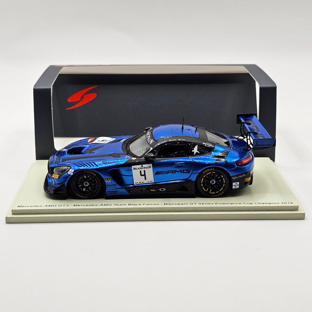 Highly detailed resin Spark model of the Mercedes-AMG GT3 #4 Team Black Falcon Blancpain GT Series Endurance Cup Champion 2018 in 1/43 scale, measuring approximately 10cm in length.