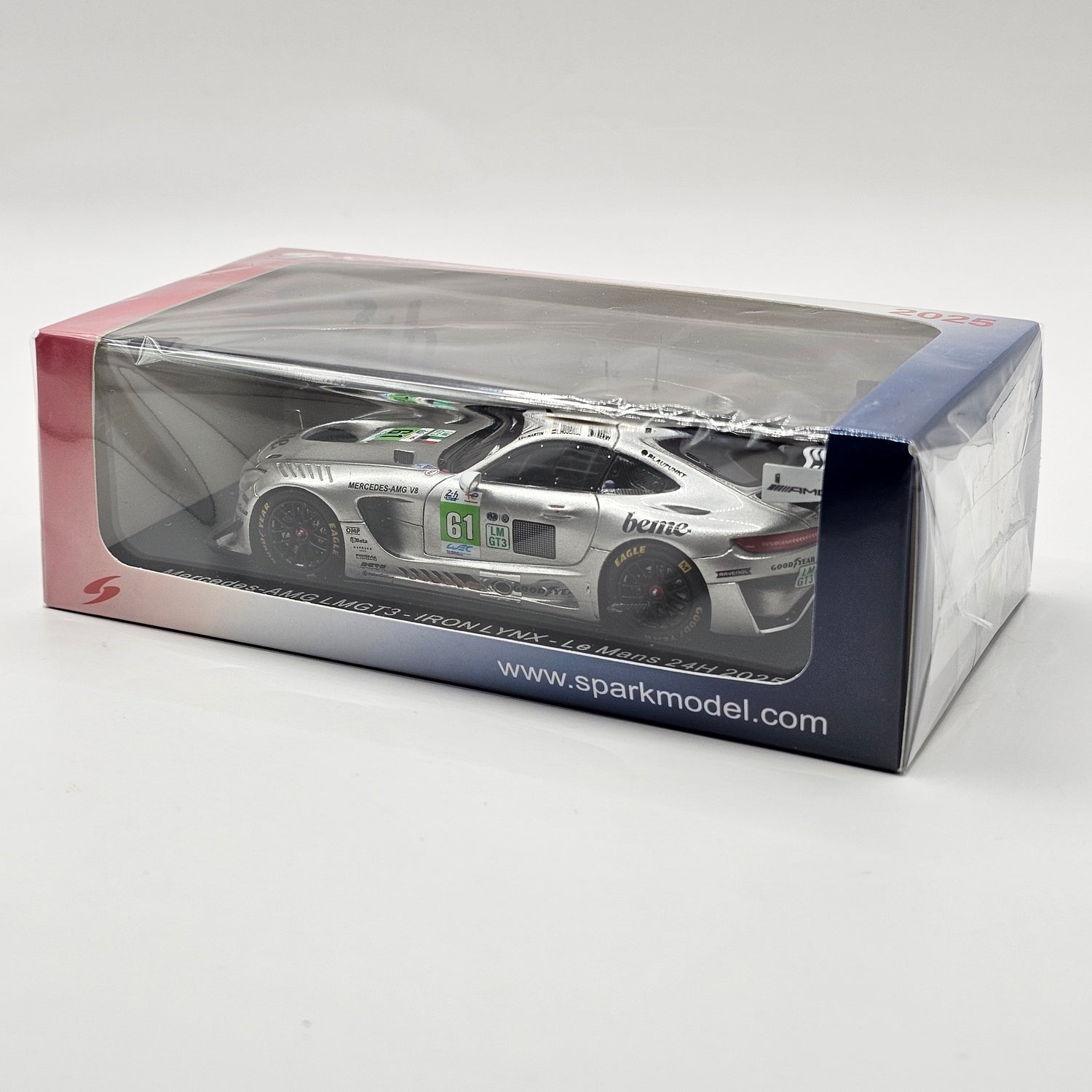 Highly detailed resin Spark model of the Mercedes-AMG LMGT3 #61 Iron Lynx 24 Hours of Le Mans 2025, driven by Martin Berry, Lin Hodenius & Maxime Martin at the 2025 24 Hours of Le Mans in 1/43 scale. This model measures approximately 10cm in length.