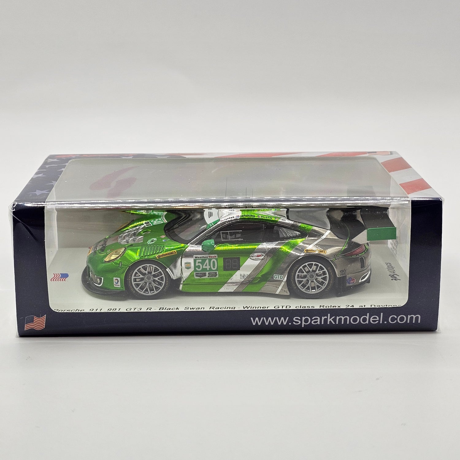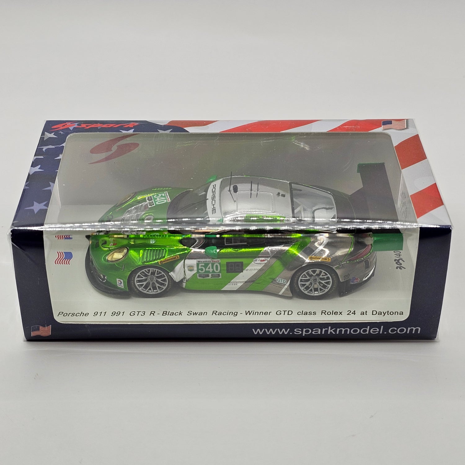 Highly detailed resin Spark model of the Porsche 911 991 GT3 R #540 Black Swan Racing 24Hrs Daytona 2016 in 1/43 scale, measuring approximately 10cm in length.