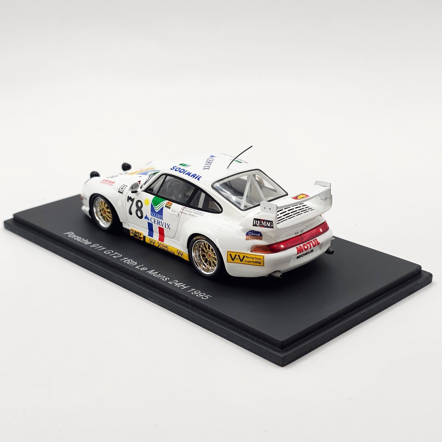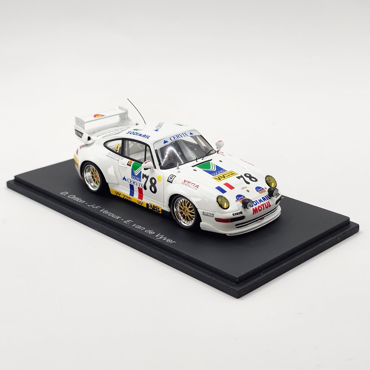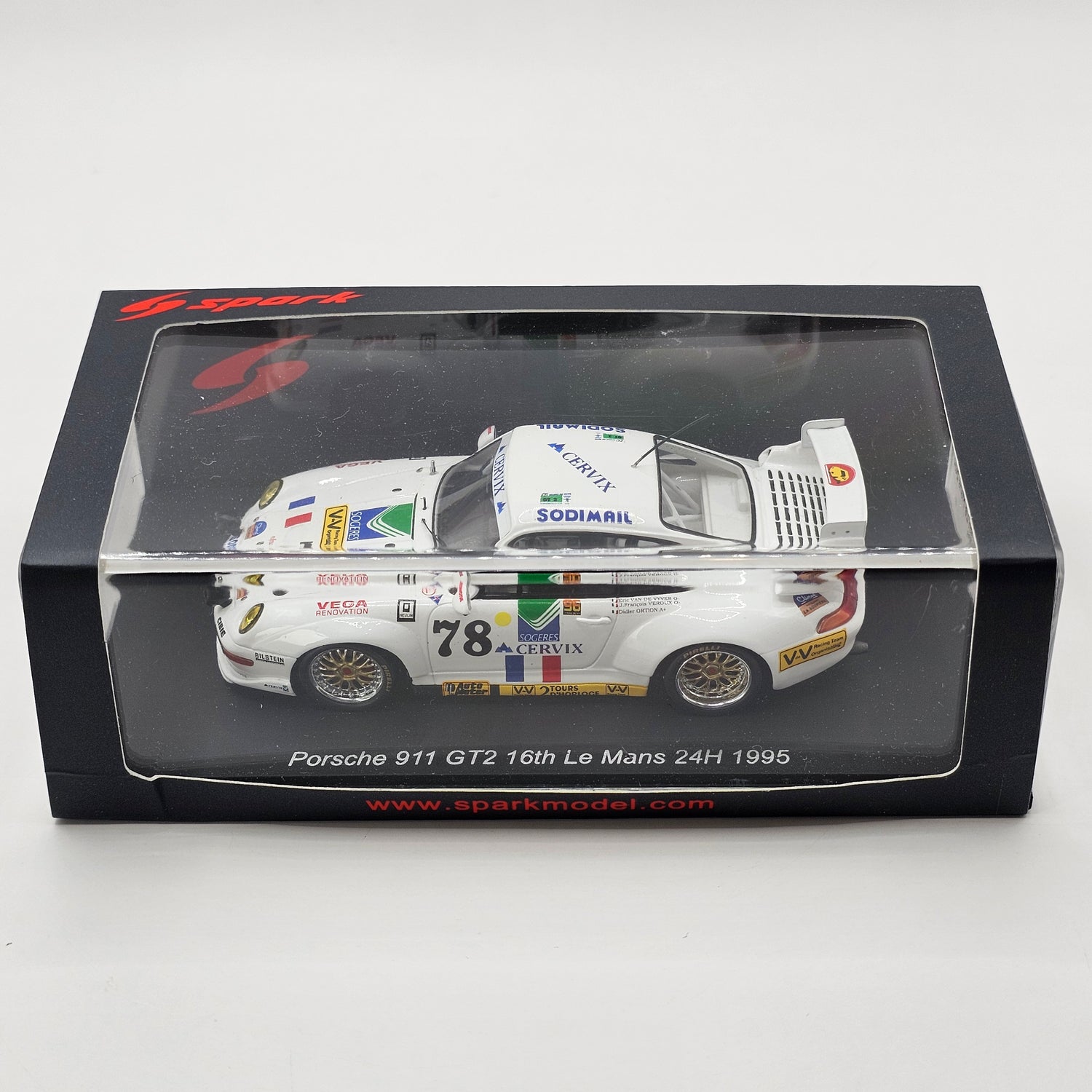 Highly detailed resin Spark model of the Porsche 911 GT2 #78 Jean-François Veroux, as by Jean-François Veroux, Eric van de Vyver & Didier Ortion at the 1995 24 Hours of Le Mans.
