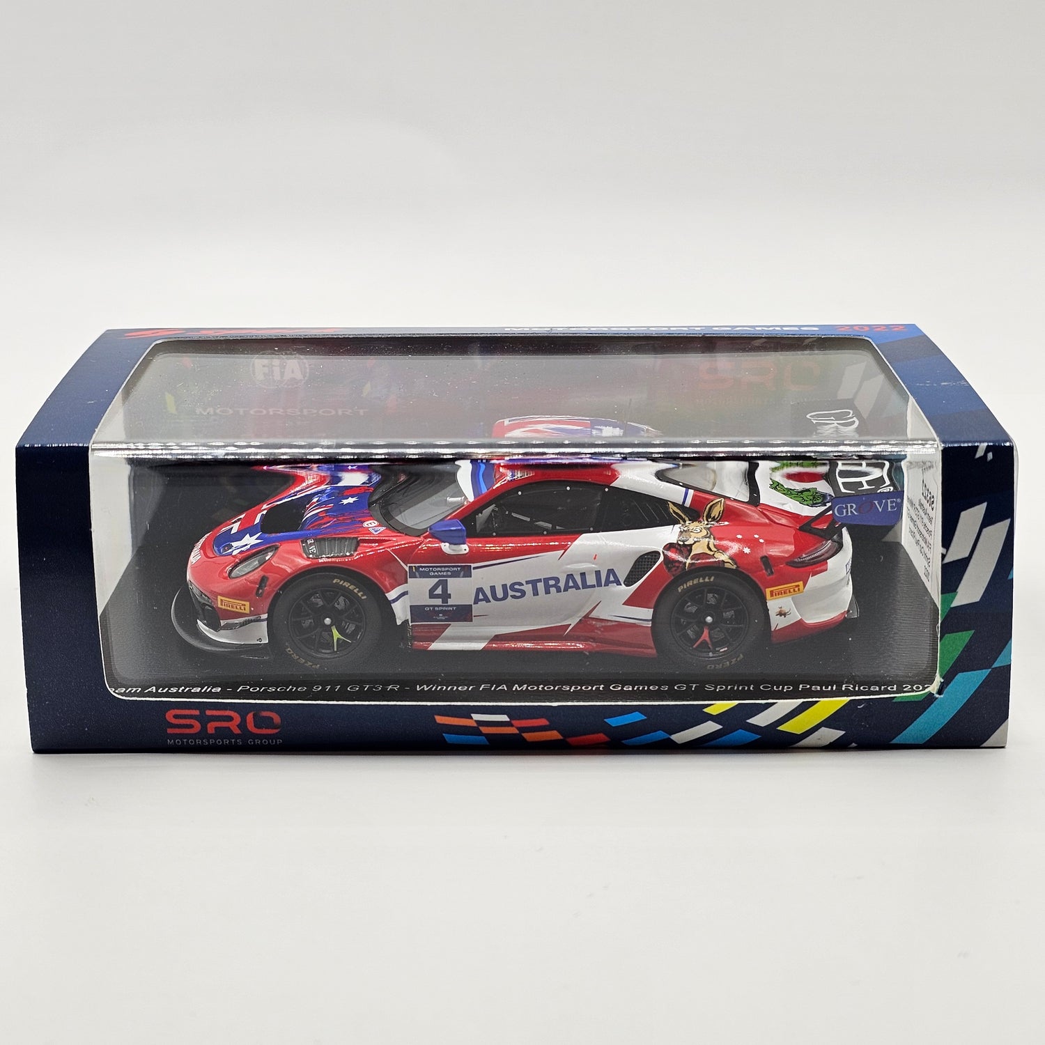Highly detailed resin Spark model of the Porsche 911 GT3R #4 Matt Campbell GT Spring Cup Paul Ricard Winner 2022 in 1/43 scale, measuring approximately 10cm in length.