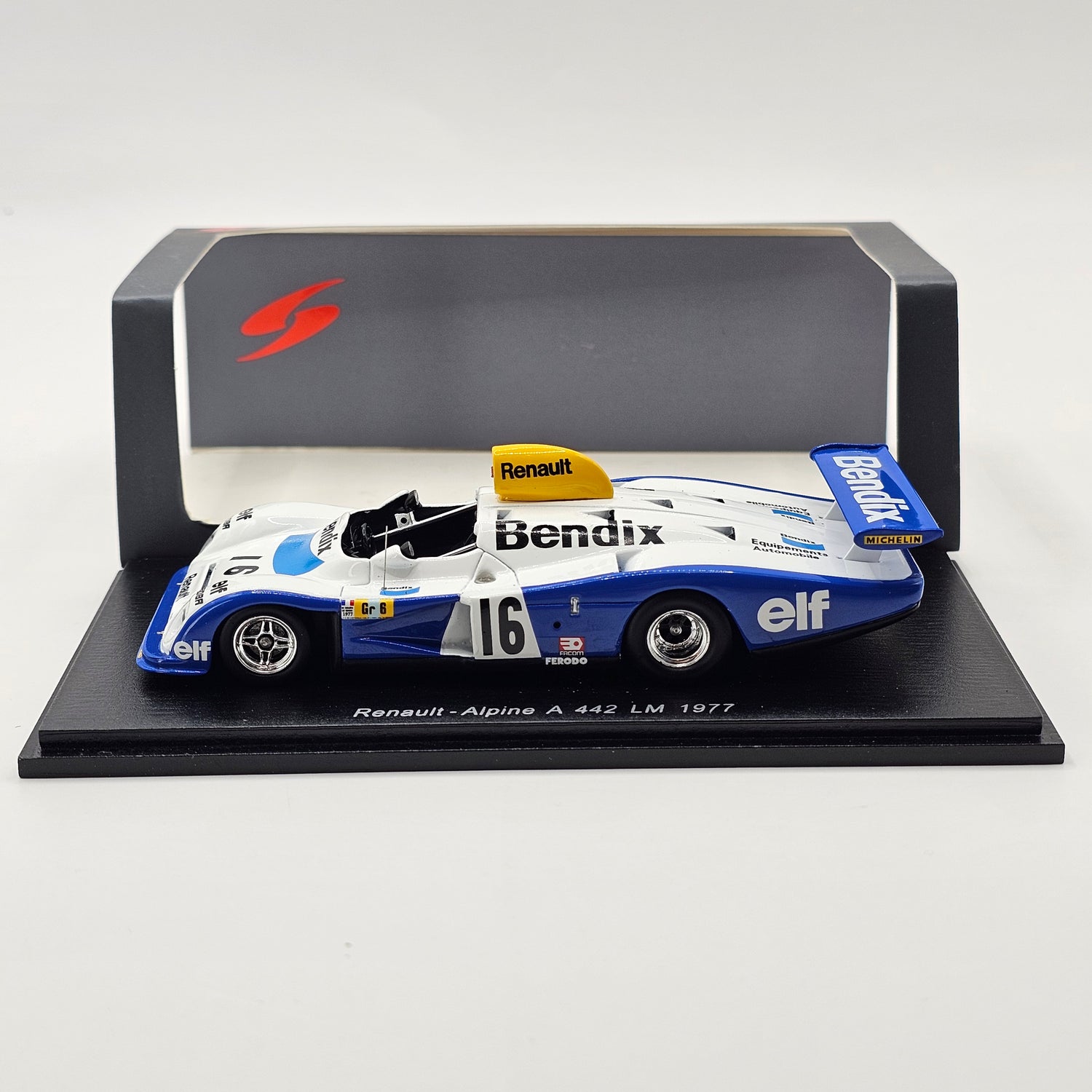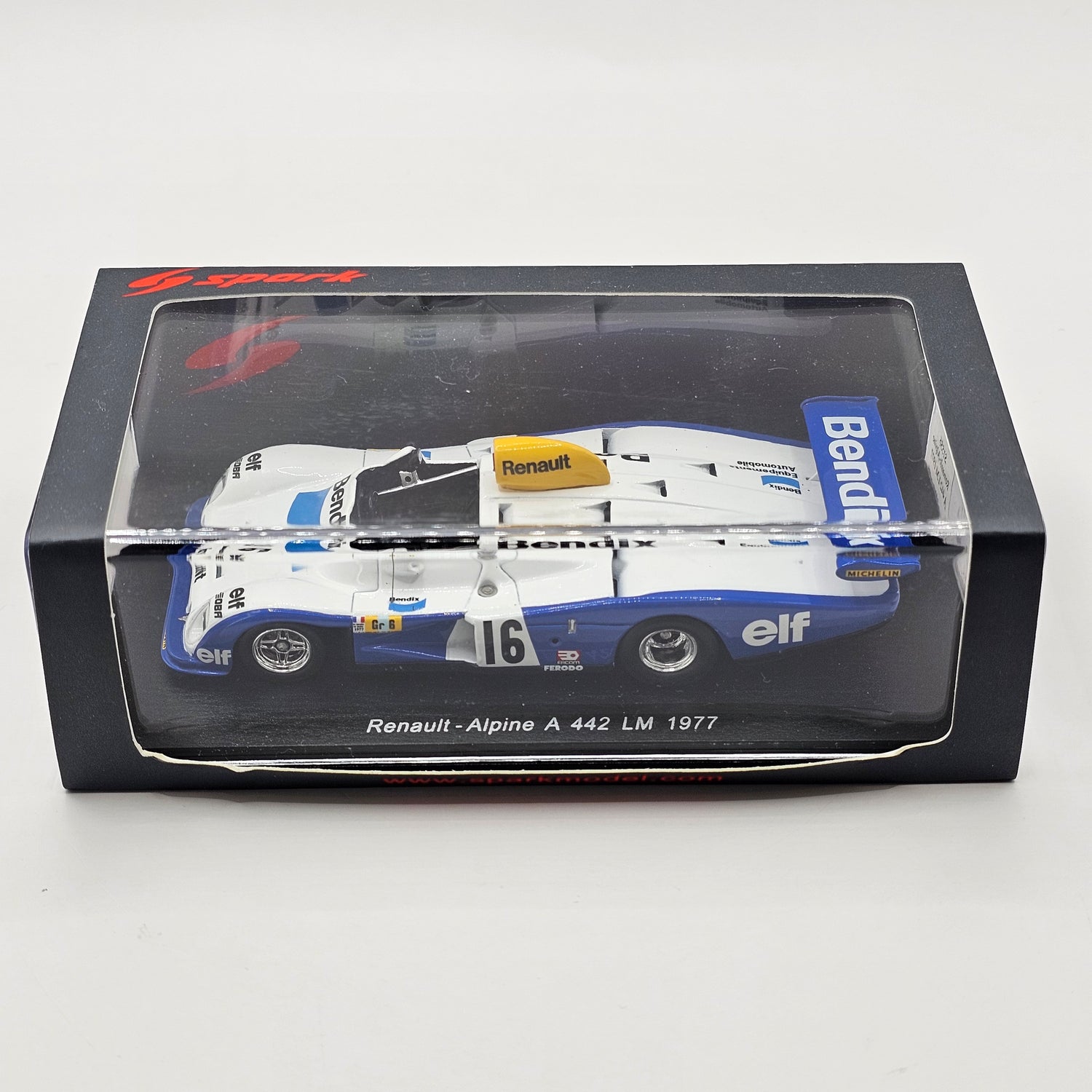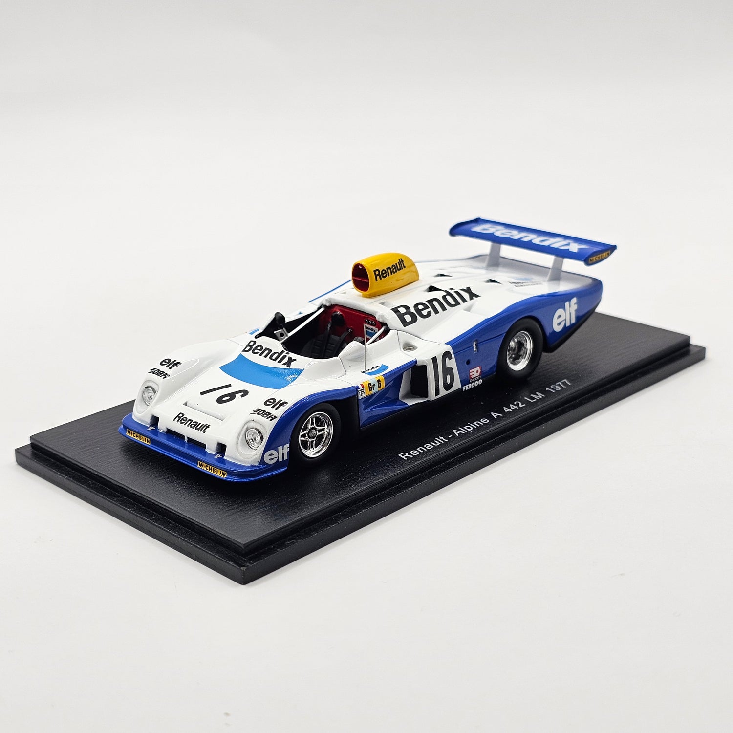 Highly detailed resin Spark model of the Renault Alpine A442 #16 H. de Chaunac, as driven by Didier Pironi, René Arnoux & Guy Fréquelin at the 1977 24 Hours of Le Mans in 1/43 scale.